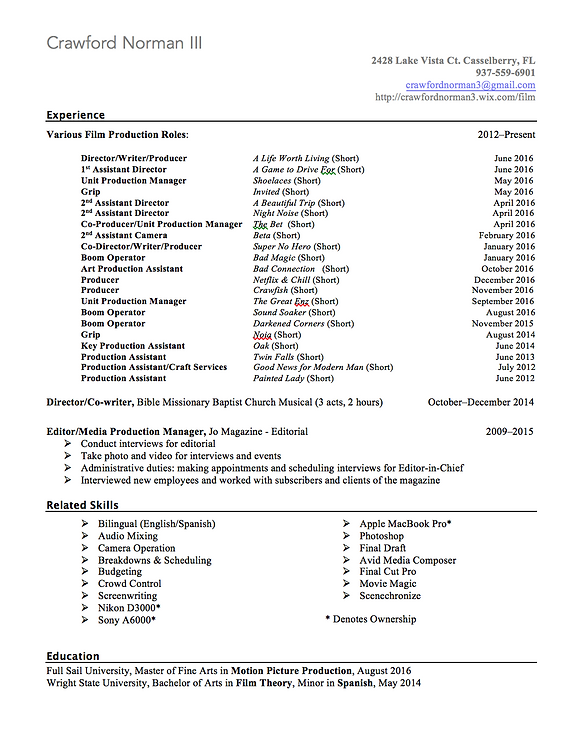 As a producer, Norman has had the privilege to work on multiple films such as The Bet, a film which was accepted into its first film festival a week after completion. He was also a grip/extra in Heat which won best film at Full Sail's 24-hour film festival. From working on over twenty independent short films to writing and directing his own films, Crawford Norman continues to create intriguing stories for the film medium.